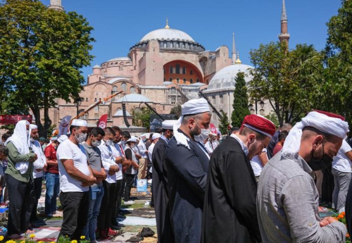 Milhares de muçulmanos participaram na sexta-feira em Istambul na primeira oração neste lugar importante da ortodoxia convertido em mesquita, na presença do presidente turco, Recep Tayyip Erdogan.