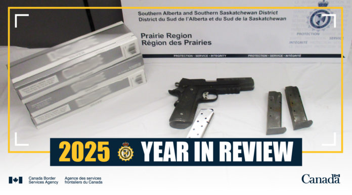A CBSA relatou também que 742 armas de fogo foram apreendidas em 585 incidentes. A maioria das armas de fogo apreendidas eram pistolas, num total de 445, mas também foram encontradas 55 espingardas, oito carabinas totalmente automáticas e 29 espingardas de caça. A CBSA também apreendeu 26.189 armas de fogo “diversas”, categoria que inclui réplicas, carregadores e silenciadores.
