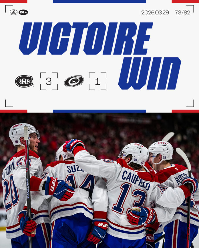Nick Suzuki foi a estrela dos Montreal Canadiens na vitória sobre os Carolina Hurricanes por 3-1, com dois golos e uma assistência. Cole Caufield contribuiu com um golo e uma assistência, enquanto o guarda-redes Jakub Dobes realizou 34 defesas decisivas, garantindo a quinta vitória consecutiva da equipa e reforçando a corrida pelos playoffs.