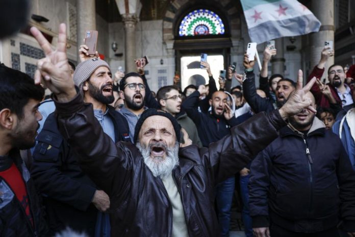 Com gritos de comemoração e louvando “Alá é grande”, ao fim da manhã, uma multidão ocupava por completo os tapetes vermelhos da também conhecida como Grande Mesquita de Damasco, de 157 metros de comprimento, e uma grande parte do seu grande pátio exterior, recolhendo-se em total silêncio para escutar as palavras do primeiro-ministro interino do governo de transição, num discurso não anunciado, em plena oração do meio-dia.