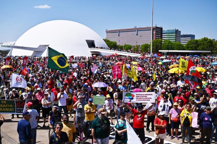 Com os gritos de “sem amnistia”, os manifestantes reuniram-se na Esplanada dos Ministérios, em Brasília, com a intenção de se dirigirem, depois, para o edifício do Parlamento.