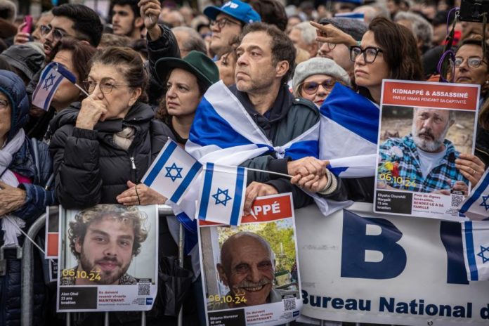 Paris, 06 out 2024 (Lusa) — Milhares de manifestantes concentraram-se hoje em Paris junto à Torre Eiffel para homenagear as mais de 1.200 pessoas mortas e centenas feitas reféns nos ataque do Hamas contra Israel de há um ano.