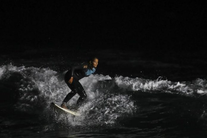 Já tinha experimentado surfar em noites de Lua cheia e com um pequeno holofote apontado para as ondas, mas “assim com tanta luz, foi a primeira vez”.
