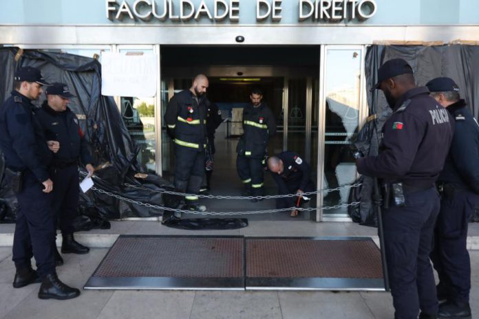 Apesar de os cadeados terem sido retirados, os alunos mantiveram-se em frente às portas, impedindo a entrada, situação que levou a PSP a retirar os estudantes à força, constatou a agência Lusa no local.