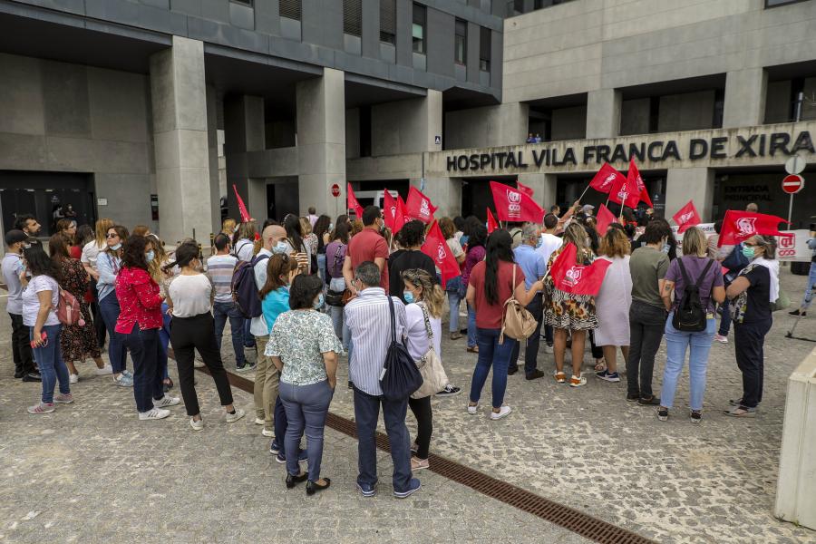 Vila Franca de Xira, 01 jun 2022 (Lusa) — Dezenas de trabalhadores do Hospital de Vila Franca de Xira, a cumprir uma greve de 24 horas, concentraram-se hoje à entrada daquela unidade de saúde para exigirem a adesão à contratação coletiva e semana de trabalho de 35 horas.