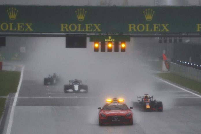 Depois de três horas de suspensão, a corrida foi iniciada e novamente interrompida, após 10 minutos, por bandeira vermelha, mantendo-se as posições da formação da grelha de partida, com Verstappen na primeira posição, devido à ‘pole position’ conquistada no sábado.